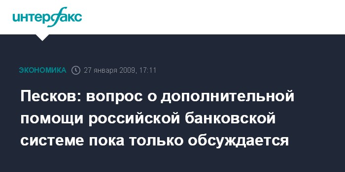 Комментируя сообщения ряда западных СМИ в беседе с журналистами, Песков сказал: "Вопрос об оказании дополнительной помощи банковской системе России обсуждается, но никаких решений по выделению конкретных сумм не принято".
