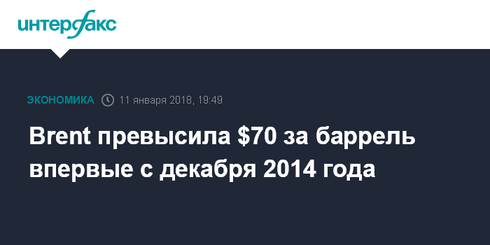 Москва. 11 января. INTERFAX.RU - Цена нефти марки Brent в ходе торгов в четверг впервые с декабря 2014 года превысила $70 за баррель.