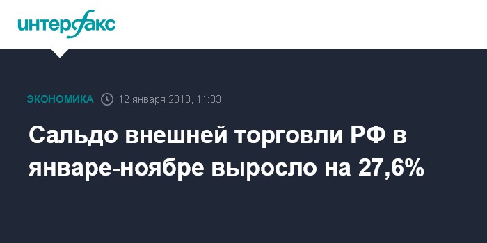 Москва. 12 января. INTERFAX.RU - Положительное сальдо внешней торговли РФ в январе-ноябре 2017 года выросло по сравнению с аналогичным периодом 2016 года на 27,6% - до $116,1 млрд, сообщили в Федеральной таможенной службе.