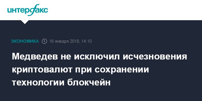 Москва. 16 января. INTERFAX.RU - Глава российского правительства Дмитрий Медведев считает, что криптовалюты могут в будущем исчезнуть, как интернет-компании 1990-х годов, в то же время на рынке останется технология блокчейн.