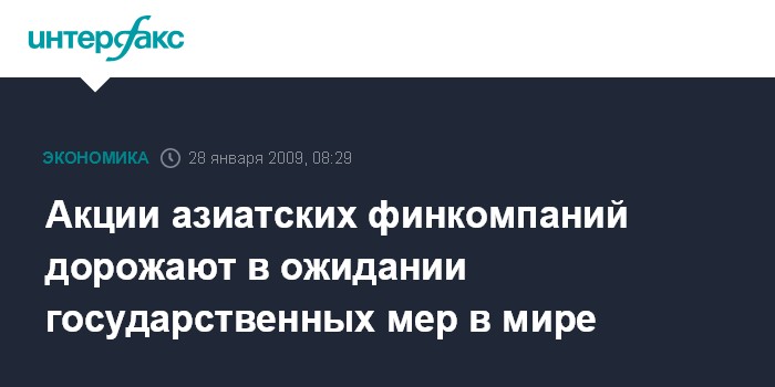 Москва. 28 января. INTERFAX.RU - Акции финансовых компании Азии дорожают в среду в ожидании реализации плана поддержки так называемых "плохих банков" в США и государственных мер стимулирования в других странах мира, сообщает агентство Bloomberg.