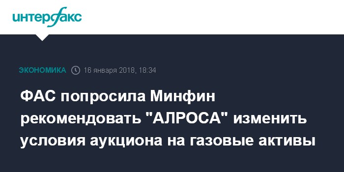 ФАС попросила Минфин рекомендовать "АЛРОСА" изменить условия аукциона на газовые активы