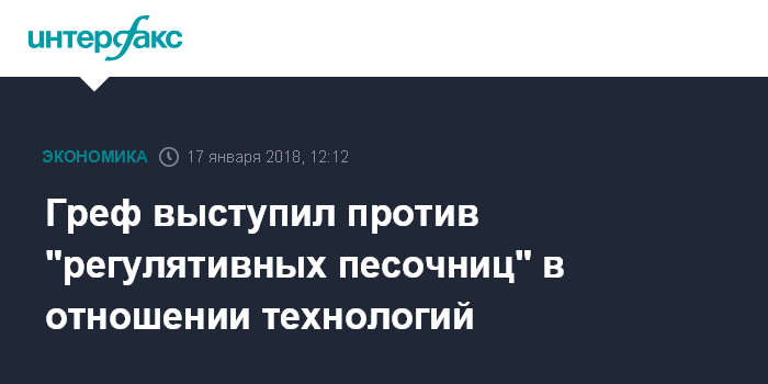 Москва. 17 января. INTERFAX.RU - Глава Сбербанка России Герман Греф считает, что вокруг технологий нужно создавать "нормальный тон", а не давать им послабления в рамках "регулятивных песочниц".