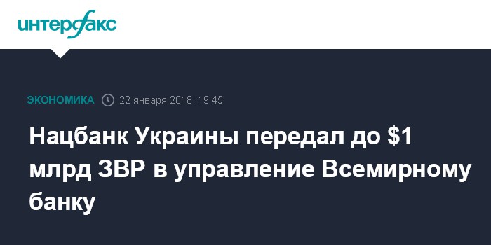 Москва. 22 января. INTERFAX.RU - Национальный банк Украины (НБУ) передал до $1 млрд золотовалютных резервов (ЗВР) страны в управление Всемирному банку (ВБ), сообщил заместитель главы центробанка Олег Чурий.