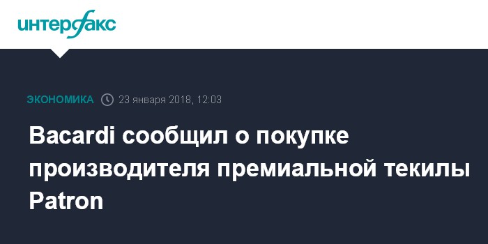 Москва. 23 января. INTERFAX.RU - Один из ведущих производителей алкогольных напитков Bacardi Limited сообщил о приобретении производителя премиальной текилы Patron Spirits International AG.