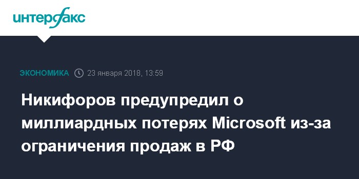 Москва. 23 января. INTERFAX.RU - Ограничения поставок ПО российским клиентам из-за возможных санкционных рисков чреваты для Microsoft миллиардными потерями, заявил журналистам глава Минкомсвязи РФ Николай Никифоров в кулуарах форума в Давосе.