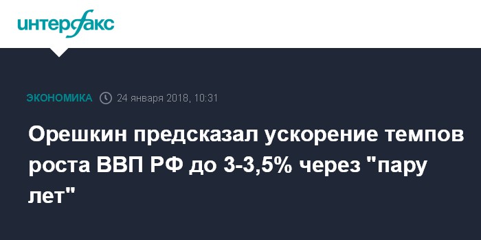 Москва. 24 января. INTERFAX.RU - Рост российской экономики может ускориться до 3-3,5% в год через "пару лет", считает глава Минэкономразвития РФ Максим Орешкин