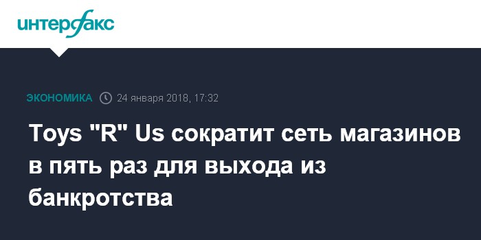 Москва. 24 января. INTERFAX.RU - Американская Toys "R" Us, владелец одной из крупнейших сетей магазинов игрушек, планирует закрыть 182 магазина в США в рамках плана по выходу из банкротства, пишет The Wall Street Journal.