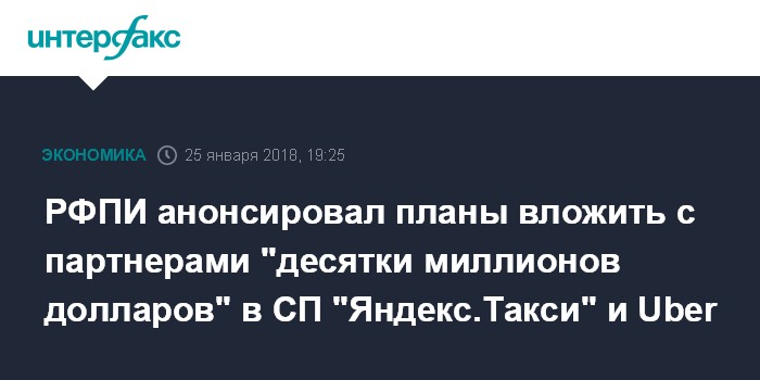 Москва. 25 января. INTERFAX.RU - Российский фонд прямых инвестиций (РФПИ) с партнерами планирует вложить в совместное предприятие "Яндекс.Такси" и Uber десятки миллионов долларов, сообщил журналистам глава фонда Кирилл Дмитриев в "Русском доме", организованном Росконгрессом в рамках Всемирного экономического форума в Давосе.