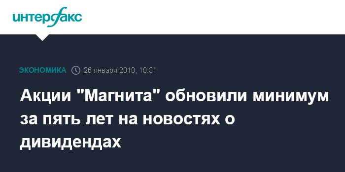 Москва. 26 января. INTERFAX.RU - Акции "Магнита", падавшие с утра после публикации слабого финотчета компании по МСФО за четвертый квартал, к вечеру ускорили падение на новостях о намерении компании не выплачивать дивиденды в текущем году; потери бумаг превысили 10% - цены откатились к уровням пятилетней давности (с января 2013 года).