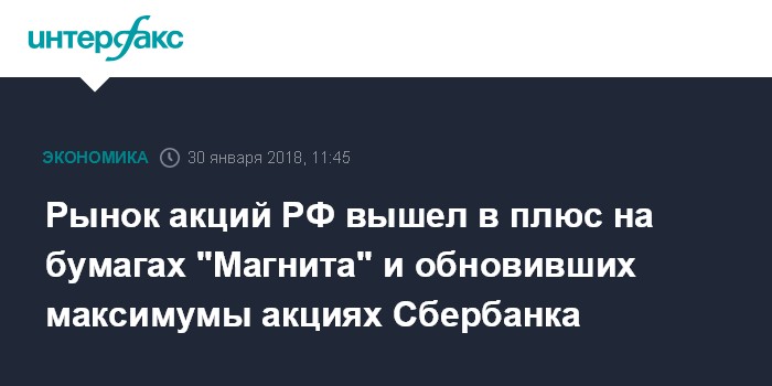 Рынок акций РФ вышел в плюс на бумагах "Магнита" и обновивших максимумы акциях Сбербанка