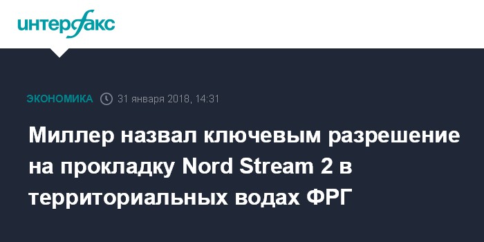 Москва. 31 января. INTERFAX.RU - Решение германского регулятора разрешить строительство газопровода "Северный поток 2" открывает возможность практической реализации проекта у берегов федеративной республики, заявил журналистам председатель правления "Газпрома" Алексей Миллер.