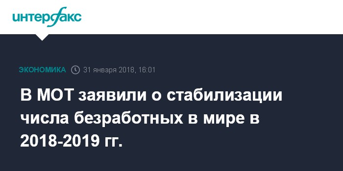 МОТ прогнозирует, что в 2018 году число безработных сократится до 192,3 млн человек по сравнению со 192,7 млн человек в прошлом году, а в 2019 году увеличится до 193,6 млн человек.