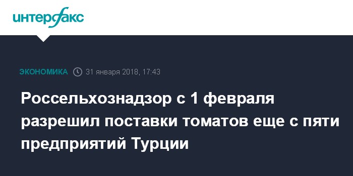 Москва. 31 января. INTERFAX.RU - Россельхознадзор с 1 февраля разрешил поставки томатов еще с пяти предприятий Турции, сообщает служба.