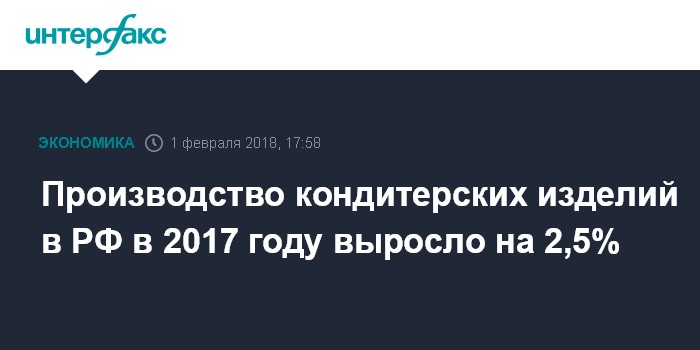 Москва. 1 февраля. INTERFAX.RU - Производство всех видов кондитерских изделий в России в 2017 году выросло на 2,5%, до 3,63 млн тонн, сообщили в Центре исследований кондитерского рынка со ссылкой на данные Росстата.