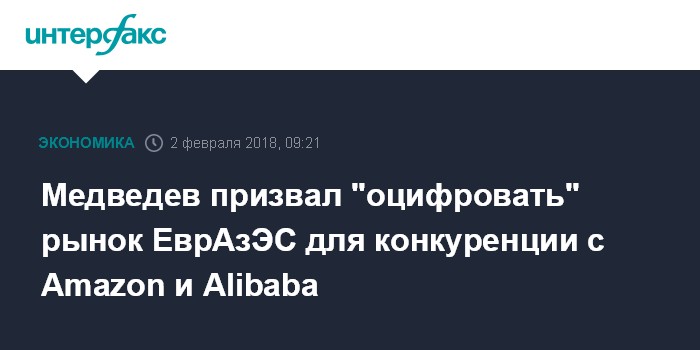 Москва. 2 февраля. INTERFAX.RU - Премьер РФ Дмитрий Медведев призвал партнеров по Евразийскому союзу как можно быстрее "оцифровать" рынок ЕвраАзЭС на собственной платформе, чтобы не уступить его таким глобальным игрокам как Amazon и Alibaba.