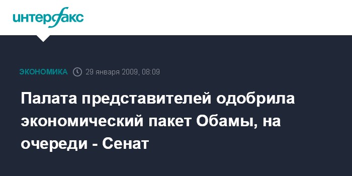 Вашингтон. 29 января. INTERFAX.RU - Палата представителей Конгресса США 244 голосами "за" при 188 голосов "против" одобрила в среду план поддержки американской экономики объемом более $800 млрд, призванный вывести ее из рецессии. Законопроект теперь передается в Сенат, где демократам для его одобрения требуется хотя бы несколько голосов республиканцев. Между тем представители Республиканской партии продолжают требовать увеличения налоговой составляющей плана.