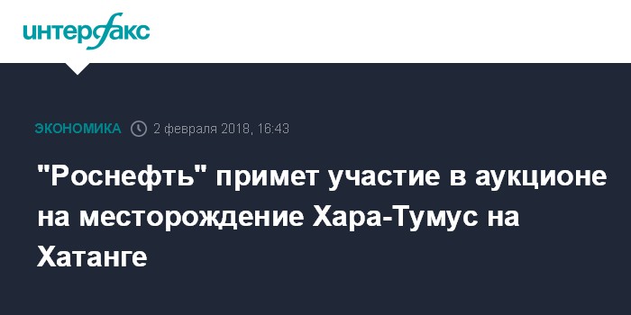 Москва. 2 февраля. INTERFAX.RU - "Роснефть" подала заявку на участие в аукционе на разработку нефтегазового месторождения Хара-Тумус в районе Хатангского залива на Таймыре, сообщили "Интерфаксу" в компании.