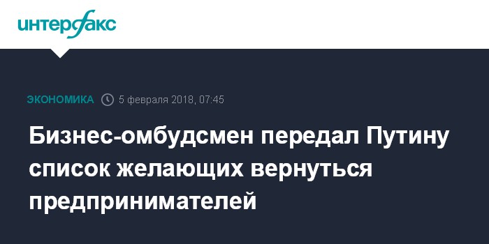 Москва. 5 февраля. INTERFAX.RU - Уполномоченный при президенте по правам предпринимателей Борис Титов передал Владимиру Путину список бизнесменов, которые скрываются от российского правосудия в Великобритании, но хотят вернуться. Он сообщил об этом в своем фейсбуке. Он не опубликовал список, но сказал, что там уже больше десяти имен, а обращения продолжают поступать.