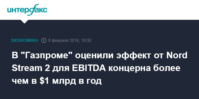 Москва. 6 февраля. INTERFAX.RU - Экономический эффект от проекта "Северный поток 2" на свободный денежный поток и EBITDA "Газпрома" от полной консолидации и более низких транспортных затрат может существенно превысить $1 млрд в год, заявил зампред правления концерна Андрей Круглов на встрече с инвесторами в Нью-Йорке.