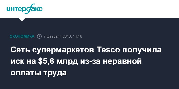 Почти 100 работниц торгового зала подали коллективный иск, заявив, что они зарабатывают в среднем на 3 фунта в час меньше мужчин, занятых на складских должностях. В случае полного удовлетворения иска Tesco придется выплатить до 20 тыс. фунтов каждому из 200 тыс. работников, что станет первым прецедентом подобного масштаба в данной сфере.