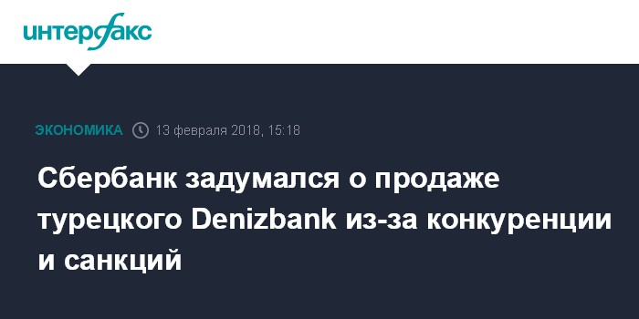 Москва. 13 февраля. INTERFAX.RU - Сбербанк России задумался о продаже турецкого Denizbank из-за ужесточения конкуренции и действия санкций, сообщил журналистам президент - председатель правления Сбербанка Герман Греф.
