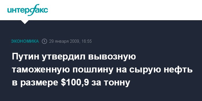 Давос. 29 января. INTERFAX.RU - Премьер РФ Владимир Путин подписал постановление правительства "Об утверждении ставок вывозных таможенных пошлин на нефть сырую и на отдельные категории товаров, выработанные из нефти, вывозимые с территории РФ за пределы государств - участников соглашений о Таможенном союзе".