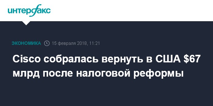 Москва. 15 февраля. INTERFAX.RU - Американская Cisco Systems Inc, крупнейший в мире производитель сетевого оборудования, вместе с публикацией отчетности за II финквартал объявила о намерении репатриировать в США около $67 млрд хранящихся за рубежом денежных средств после изменения налогового законодательства.