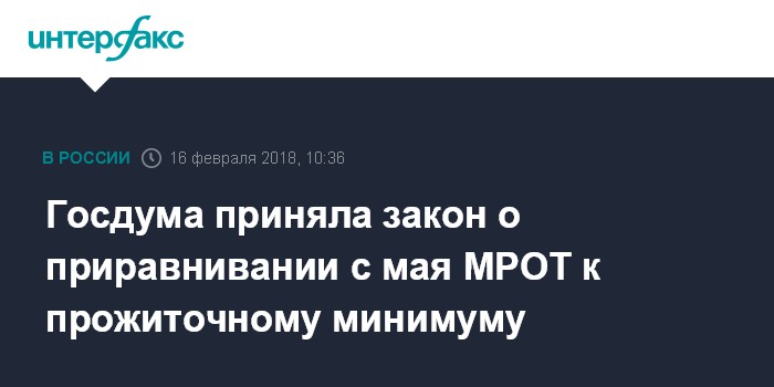 Москва. 16 февраля. INTERFAX.RU - Госдума в пятницу приняла в третьем окончательном чтении президентский закон о повышении минимального размера оплаты труда (МРОТ) до 100% прожиточного минимума более чем на полгода раньше планируемого: с 1 мая 2018 года, а не с 1 января 2019 года.