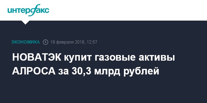 Москва. 19 февраля. INTERFAX.RU - "НОВАТЭК" выиграл аукцион по продаже газовых активов АК "АЛРОСА" , предложив 30,3 млрд рублей, сообщила компания.