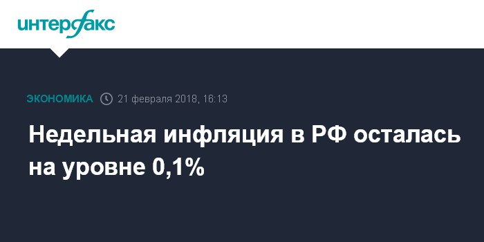 Москва. 21 февраля. INTERFAX.RU - Недельная инфляция в России в период с 13 по 19 февраля осталась на уровне 0,1%, как и в предыдущие две недели, сообщил в среду Росстат.