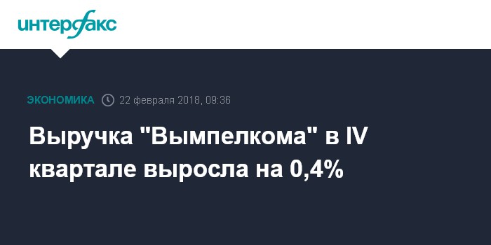 Москва. 22 февраля. INTERFAX.RU - Выручка ПАО "Вымпелком" в IV квартале 2017 года выросла на 0,4%, до 70,4 млрд рублей, говорится в финансовом отчете материнского холдинга VEON Ltd.