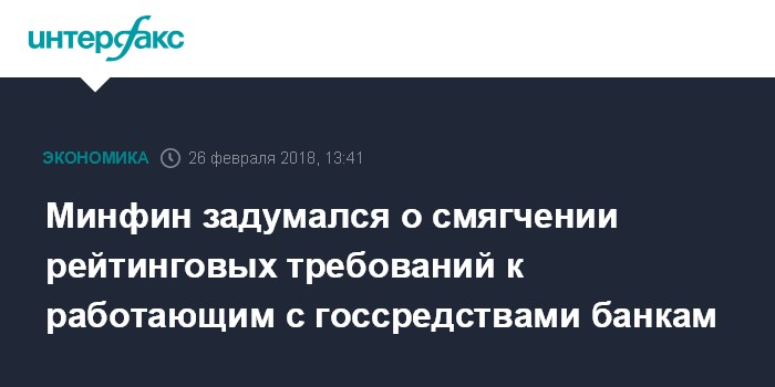 Москва. 26 февраля. INTERFAX.RU - Минфин РФ работает над снижением рейтинговых требований к банкам, работающим с госсредствами. Об этом сообщил замминистра финансов Алексей Моисеев на заседании Межрегионального банковского совета при Совете Федерации РФ.