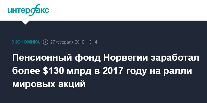 Москва. 27 февраля. INTERFAX.RU - Государственный пенсионный фонд Норвегии (он же Нефтяной фонд), самый большой фонд национального благосостояния в мире с активами объемом свыше $1 трлн, по итогам 2017 года получил доходность в размере 13,7% против 6,9% годом ранее.
