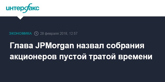 Москва. 28 февраля. INTERFAX.RU - Гендиректор и председатель совета директоров JPMorgan Chase & Co Джеймс Даймон на ежегодном дне инвестора во вторник назвал годовые собрания акционеров пустой тратой времени.