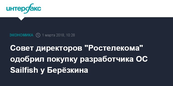 Москва. 1 марта. INTERFAX.RU - Совет директоров ПАО "Ростелеком" одобрил покупку долей в компаниях ООО "Открытая мобильная платформа" (ОМП) и ООО "Вортон", которые развивают мобильную операционную систему Sailfish.