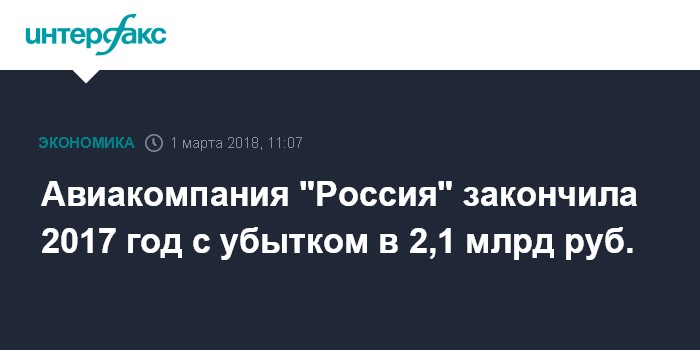 Москва. 1 марта. INTERFAX.RU - Авиакомпания "Россия" закончила 2017 год с чистым убытком в 2,1 млрд руб., говорится в отчете материнского "Аэрофлота" по МСФО.