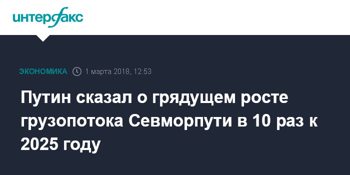 Москва. 1 марта. INTERFAX.RU - Грузопоток Северного морского пути (СМП) к 2025 году вырастет в десять раз, до 80 млн тонн, заявил президент РФ Владимир Путин в ходе ежегодного послания Федеральному Собранию.