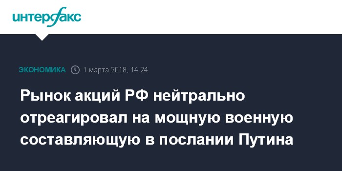 Москва. 1 марта. INTERFAX.RU - Российский рынок акций нейтрально отреагировал на мощную военную составляющую, прозвучавшую в послании президента России Владимира Путина Федеральному собранию, отмечают эксперты "Интерфакс-ЦЭА".