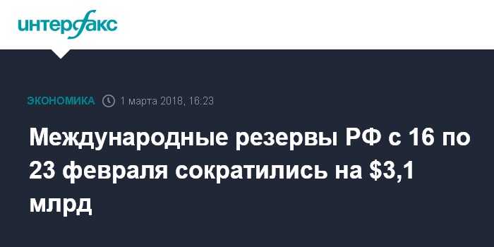 Международные резервы РФ с 16 по 23 февраля сократились на $3,1 млрд