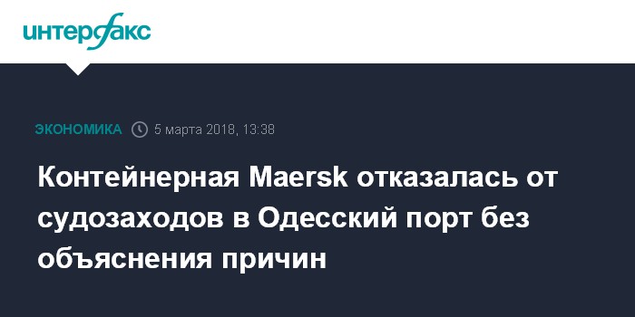 Москва. 5 марта. INTERFAX.RU - Крупнейший в мире контейнерный оператор Maersk Line с 1 апреля 2018 года исключает Одесский морской торговый порт из ротации на своем черноморском сервисе, пишет одесское издание "Думская" со ссылкой на письма компании в адрес ее клиентов.