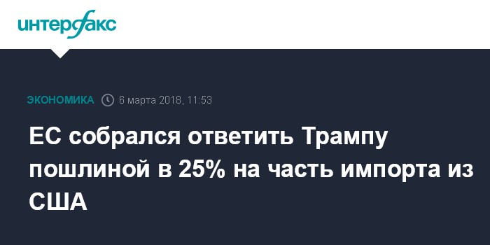 Па прошлой неделе Трамп пообещал в скором времени подписать указ о пошлинах на сталь в размере 25%, на алюминий - в размере 10%. Помимо Евросоюза, протесты в связи с этим выразили Китай, Канада, Мексика и Бразилия.