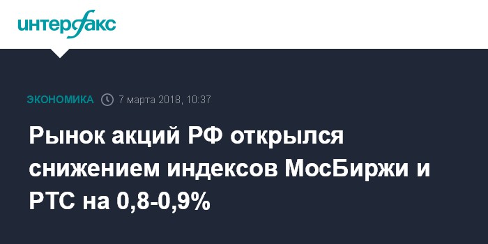 Москва. 7 марта. INTERFAX.RU - Рынок акций РФ открылся в среду снижением цен blue chips на фоне ухудшения внешней фондовой и сырьевой конъюнктуры из-за вернувшихся опасений торговых войн с США после отставки главного экономического советника Белого дома Гэри Кона; индексы МосБиржи и РТС за минуту торгов просели на 0,8-0,9%.
