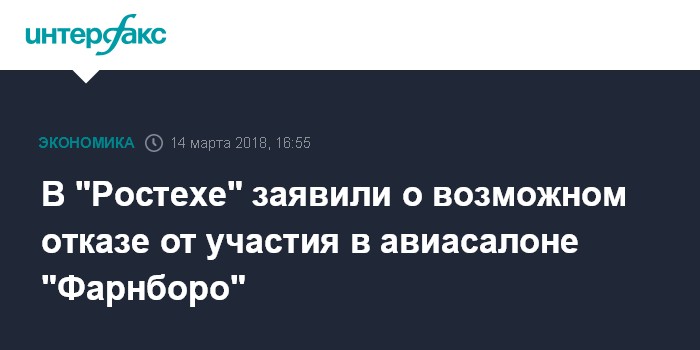 Москва. 14 марта. INTERFAX.RU - "Ростех" и его холдинги могут не поехать на выставку "Фарнборо-2018" в Великобритании, заявили в госкорпорации в среду.