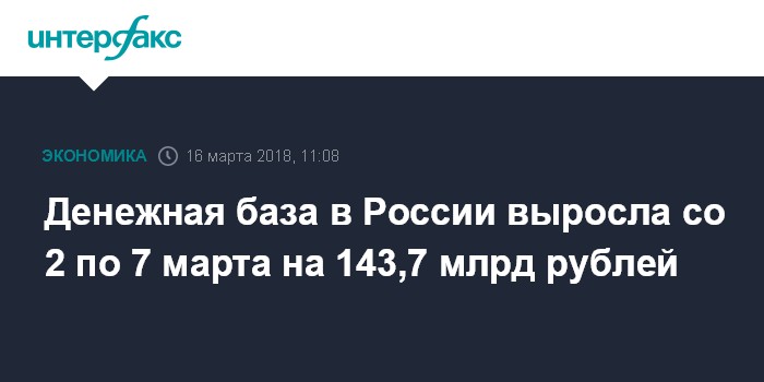 На 2 марта денежная база в России равнялась 9487,2 млрд рублей. Таким образом, за период она выросла на 1,51%, или на 143,7 млрд рублей.
