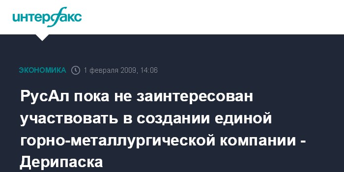 Давос. 1 февраля. INTERFAX.RU - "Российский алюминий" пока не заинтересован в участии в создании глобального российского горно-металлургического холдинга, заявил гендиректор и основной акционер компании Олег Дерипаска.