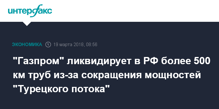 Москва. 19 марта. INTERFAX.RU - "Газпром" раскрыл масштабы ликвидации и консервации газотранспортных мощностей, которые стали ему не нужны из-за двукратного сокращения мощностей газопровода "Турецкий поток" (с 63 млрд до 31,5 млрд кубометров в год).