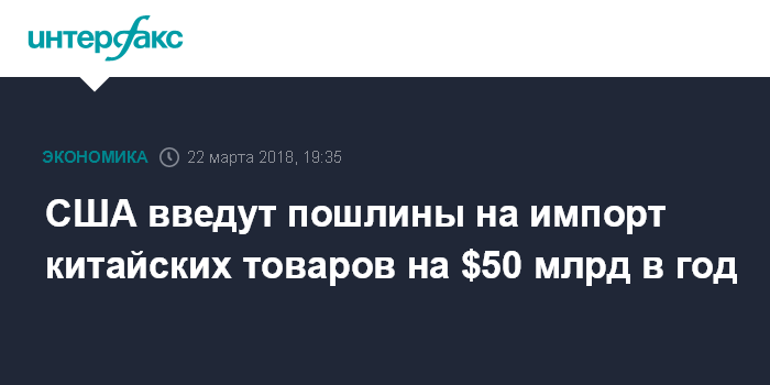 Москва. 22 марта. INTERFAX.RU - Президент США Дональд Трамп в четверг поручит торговому представителю Роберту Лайтхайзеру обеспечить введение пошлин на импорт китайских товаров стоимостью $50 млрд в год, сообщает агентство Bloomberg со ссылкой на источник в Белом доме.