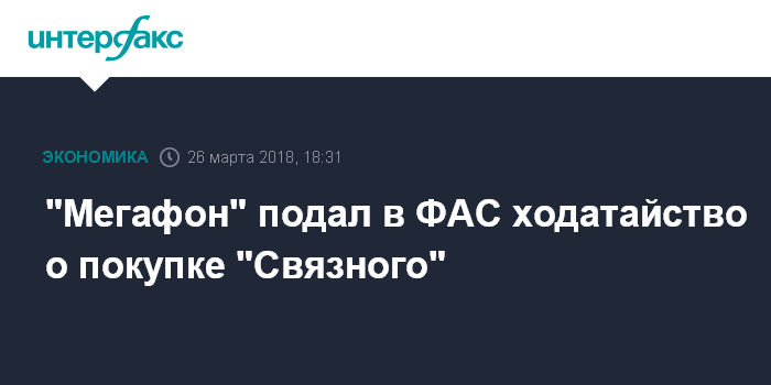 Москва. 26 марта. INTERFAX.RU - Структура ПАО "Мегафон" - "Лефборд Инвестментс Лимитед" - подала в Федеральную антимонопольную службу РФ (ФАС) ходатайство о покупке АО "Связной Логистика" и входящего в группу "Связной" ООО "Мобильный Телекоммуникационный Сервис".