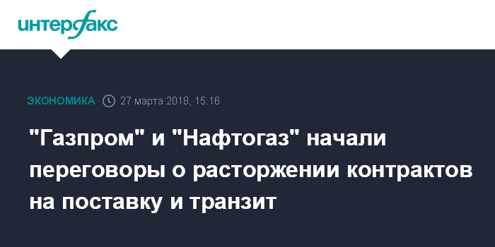 Москва. 27 марта. INTERFAX.RU - "Газпром" и "Нафтогаз Украины" официально начали переговоры о расторжении контрактов на поставку и транзит. Об этом сообщил журналистам заместитель председателя правления "Газпрома" Александр Медведев.